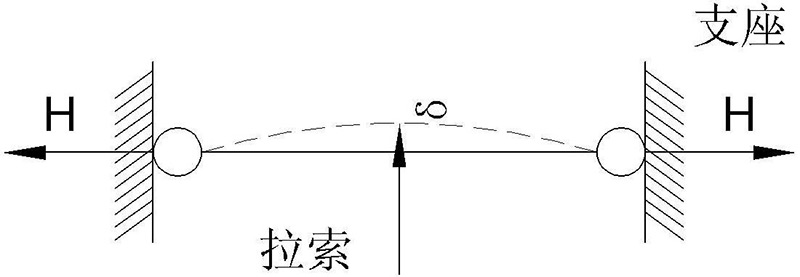 非介入式测力的方法也有两种,一种是震动频率测量法,即索的自振周期T与索内张力H、索长L、索的质量W成函数关系,由公式可知测出了索的震动周期T就可算出索内的拉力H,原理比较简单,但将震信号转化为信号,经计算机处理后再输出索力值。这个过程需要的仪器设备多,工人掌握的难度大,也不便于高空作业。另外索端的支承条件对震动周期有影响,对索力测量的精确度也有影响。另一种测量索力的原理是基于力学原理,如下图所示,索力的横向位移δ与索的拉力H、横向力P和索的长度之间有函数关系。位移保持一定数值情况下,索拉力H越大,横向作用力P越大。